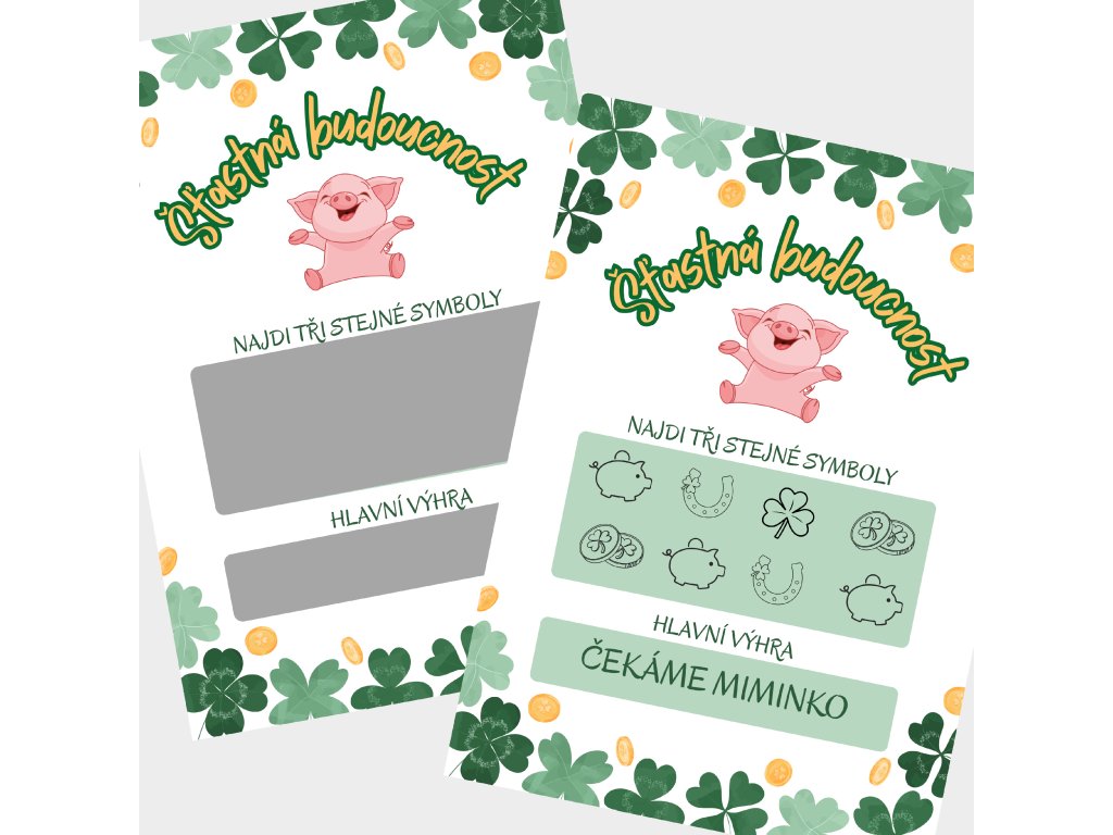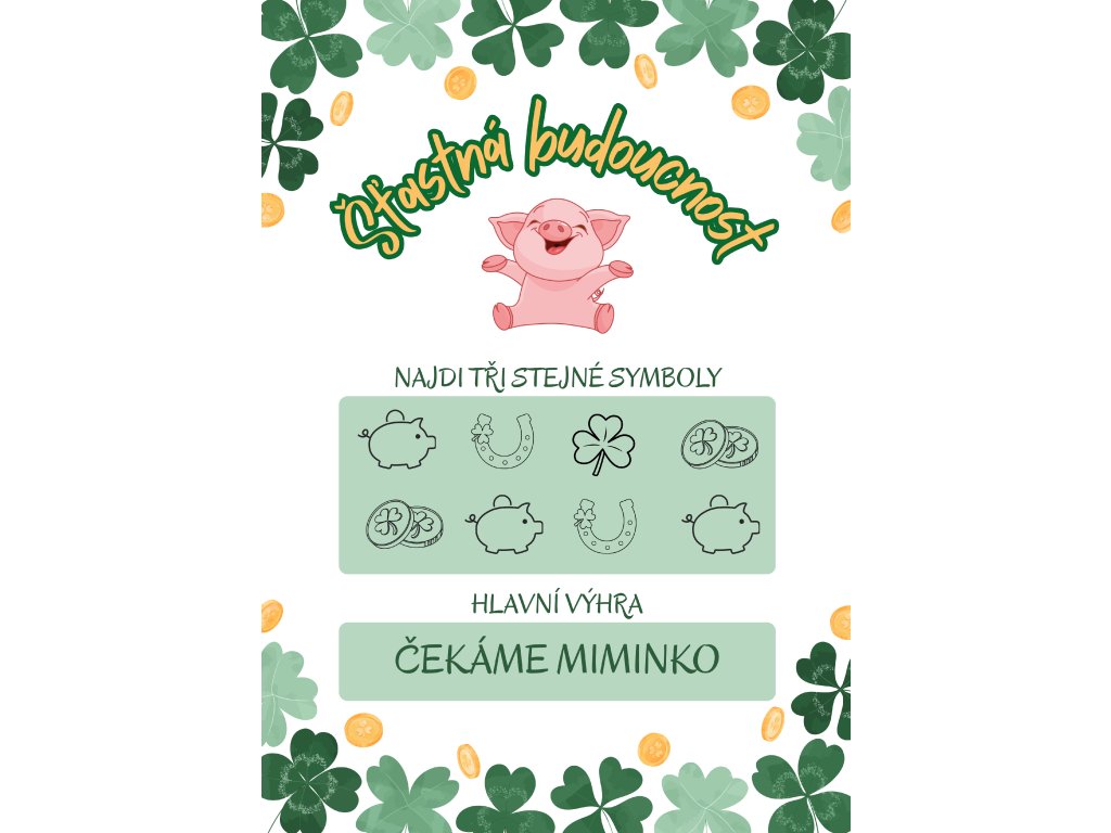 Veselý stírací los "šťastná budoucnost" s oznámením těhotenství - po setření budou obdarovaným nalezeny tři stejné symboly a následně odhalen text ČEKÁME MIMINKO!